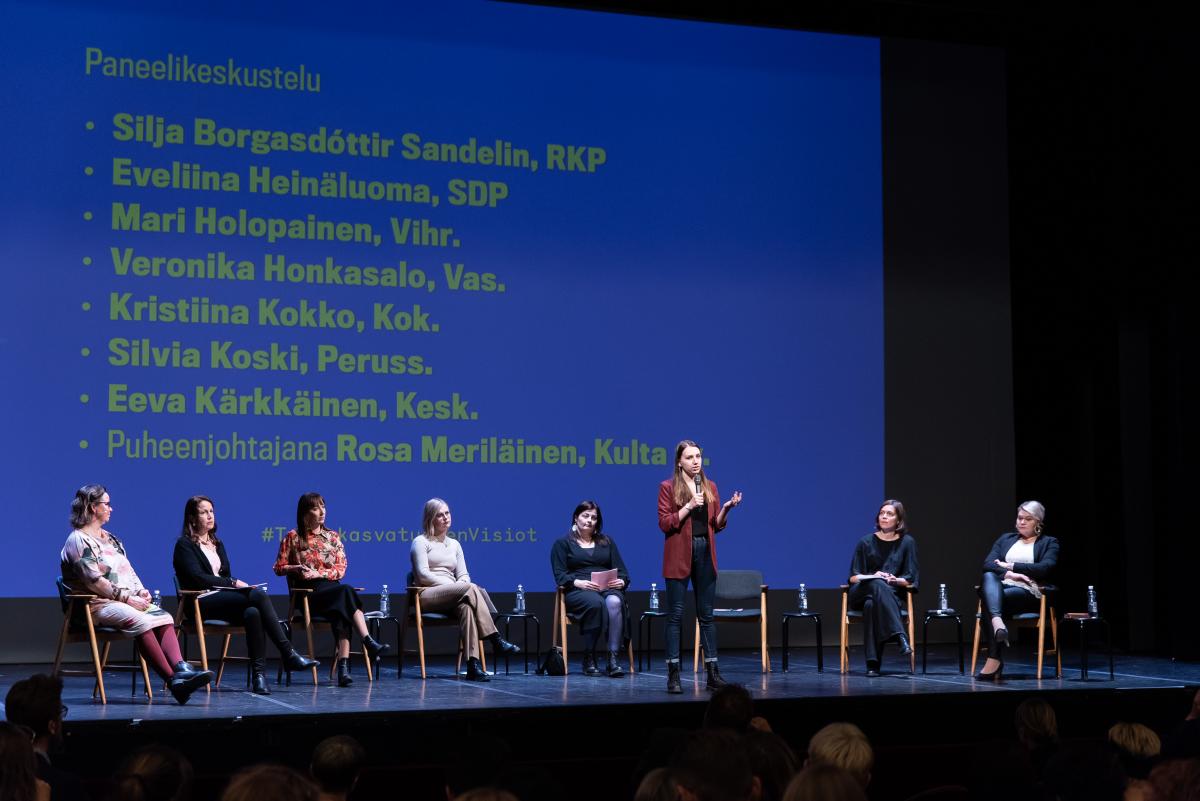 Taideyliopisto järjesti 14.11. Helsingin Svenska Teaternissa taidekasvatuksen ja -koulutuksen visioiden julkaisutilaisuuden, jonka yhteydessä seitsemän suurimman eduskuntapuolueen edustajat ottivat paneelikeskustelussa kantaa visioihin ja kertoivat näkökulmistaan taidekoulutukseen ja -kasvatukseen.