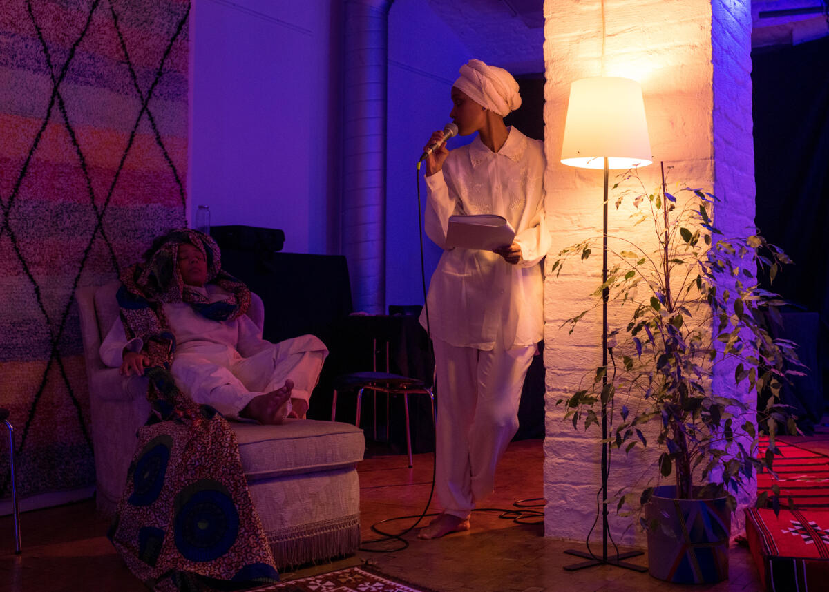 Sonya Lindforsin ja Maryan Abdulkarimin performatiivinen tapaaminen. Tapahtuma on osa Tutkimuspaviljongin esitysten viikkoa 12.-16.6.